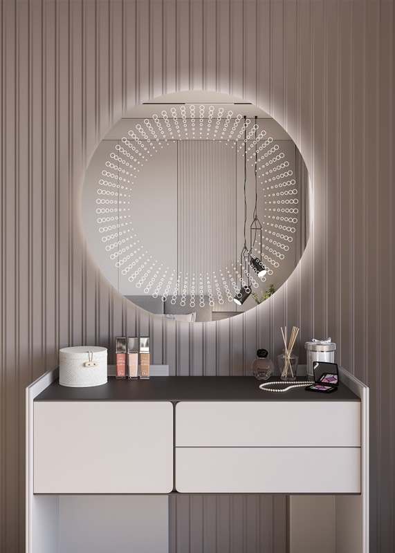 Όλα τα παραπάνω τα συνδυάσαμε με Led φωτισμό που ενεργοποιείται με αισθητήρα κίνησης ανέπαφα μόλις πλησιάσουμε το χέρι μας στο κάτω μέρος του καθρέφτη, ο οποίος διαχέεται περιμετρικά του καθρέφτη και διακριτικά μέσα από το χαραγμένο σχέδιο, δημιουργώντας έτσι ένα ανεπανάληπτο οπτικό φαινόμενο που θα εντυπωσιάσει εσάς και τους καλεσμένους σας.