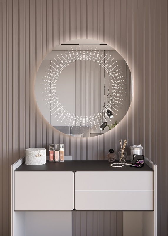 Όλα τα παραπάνω τα συνδυάσαμε με Led φωτισμό που ενεργοποιείται με αισθητήρα κίνησης ανέπαφα μόλις πλησιάσουμε το χέρι μας στο κάτω μέρος του καθρέφτη, ο οποίος διαχέεται περιμετρικά του καθρέφτη και διακριτικά μέσα από το χαραγμένο σχέδιο, δημιουργώντας έτσι ένα ανεπανάληπτο οπτικό φαινόμενο που θα εντυπωσιάσει εσάς και τους καλεσμένους σας.