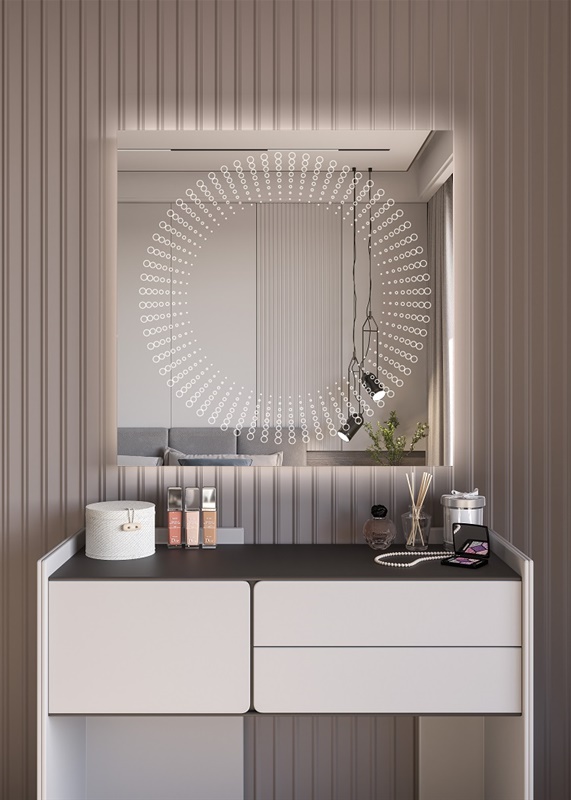 Όλα τα παραπάνω τα συνδυάσαμε με Led φωτισμό που ενεργοποιείται με αισθητήρα κίνησης ανέπαφα μόλις πλησιάσουμε το χέρι μας στο κάτω μέρος του καθρέφτη, ο οποίος διαχέεται περιμετρικά του καθρέφτη και διακριτικά μέσα από το χαραγμένο σχέδιο, δημιουργώντας έτσι ένα ανεπανάληπτο οπτικό φαινόμενο που θα εντυπωσιάσει εσάς και τους καλεσμένους σας.