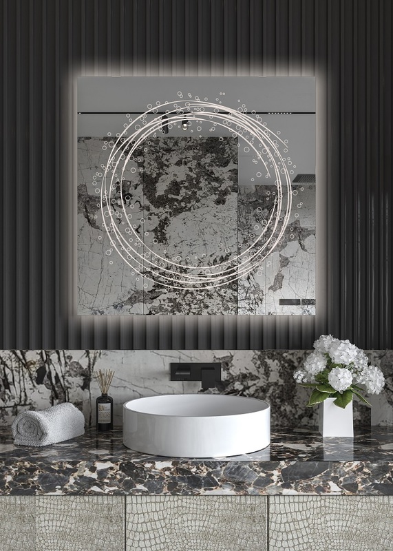 Όλα τα παραπάνω τα συνδυάσαμε με Led φωτισμό που ενεργοποιείται με αισθητήρα κίνησης ανέπαφα μόλις πλησιάσουμε το χέρι μας στο κάτω μέρος του καθρέφτη, ο οποίος διαχέεται περιμετρικά του καθρέφτη και διακριτικά μέσα από το χαραγμένο σχέδιο, δημιουργώντας έτσι ένα ανεπανάληπτο οπτικό φαινόμενο που θα εντυπωσιάσει εσάς και τους καλεσμένους σας.